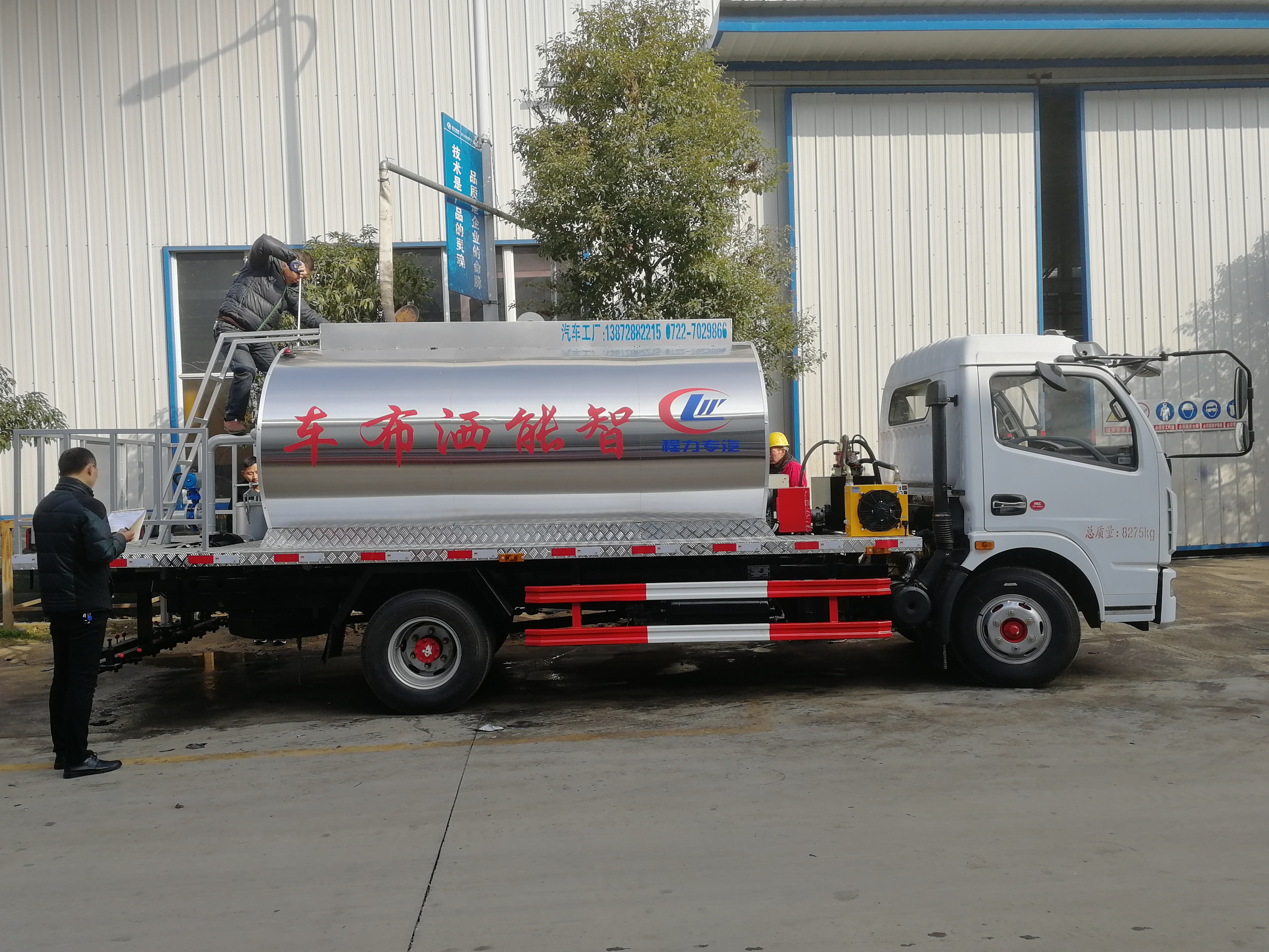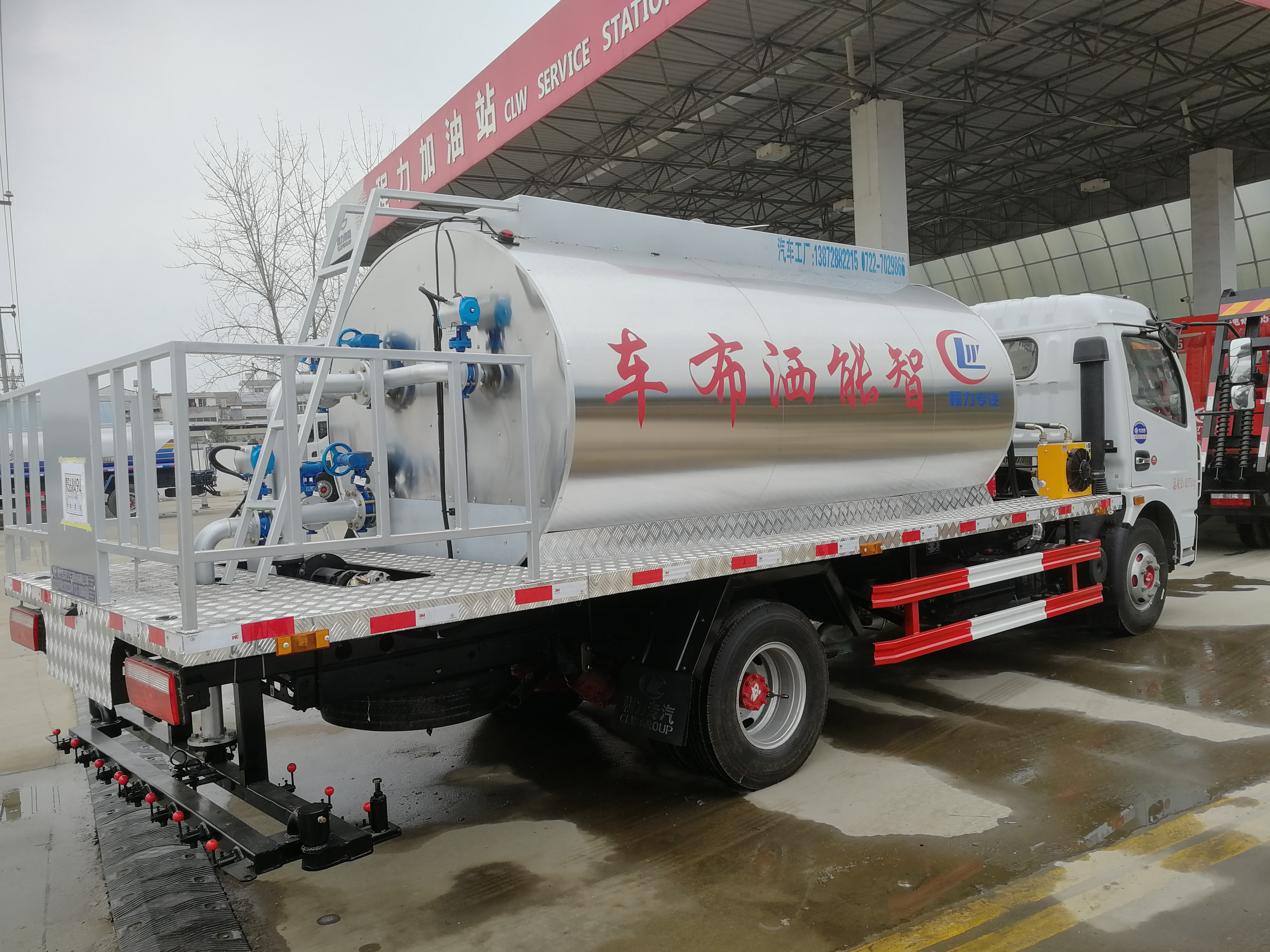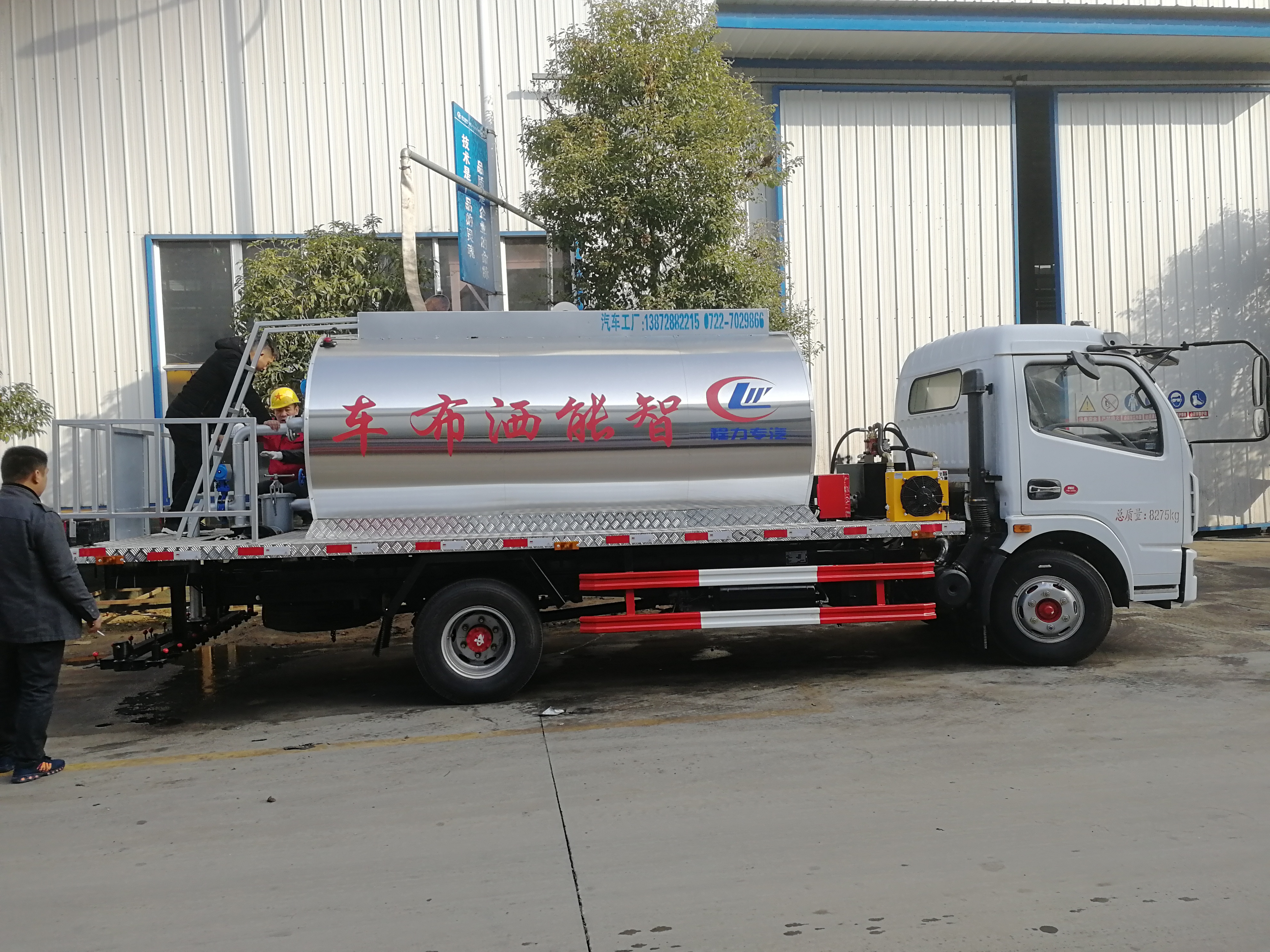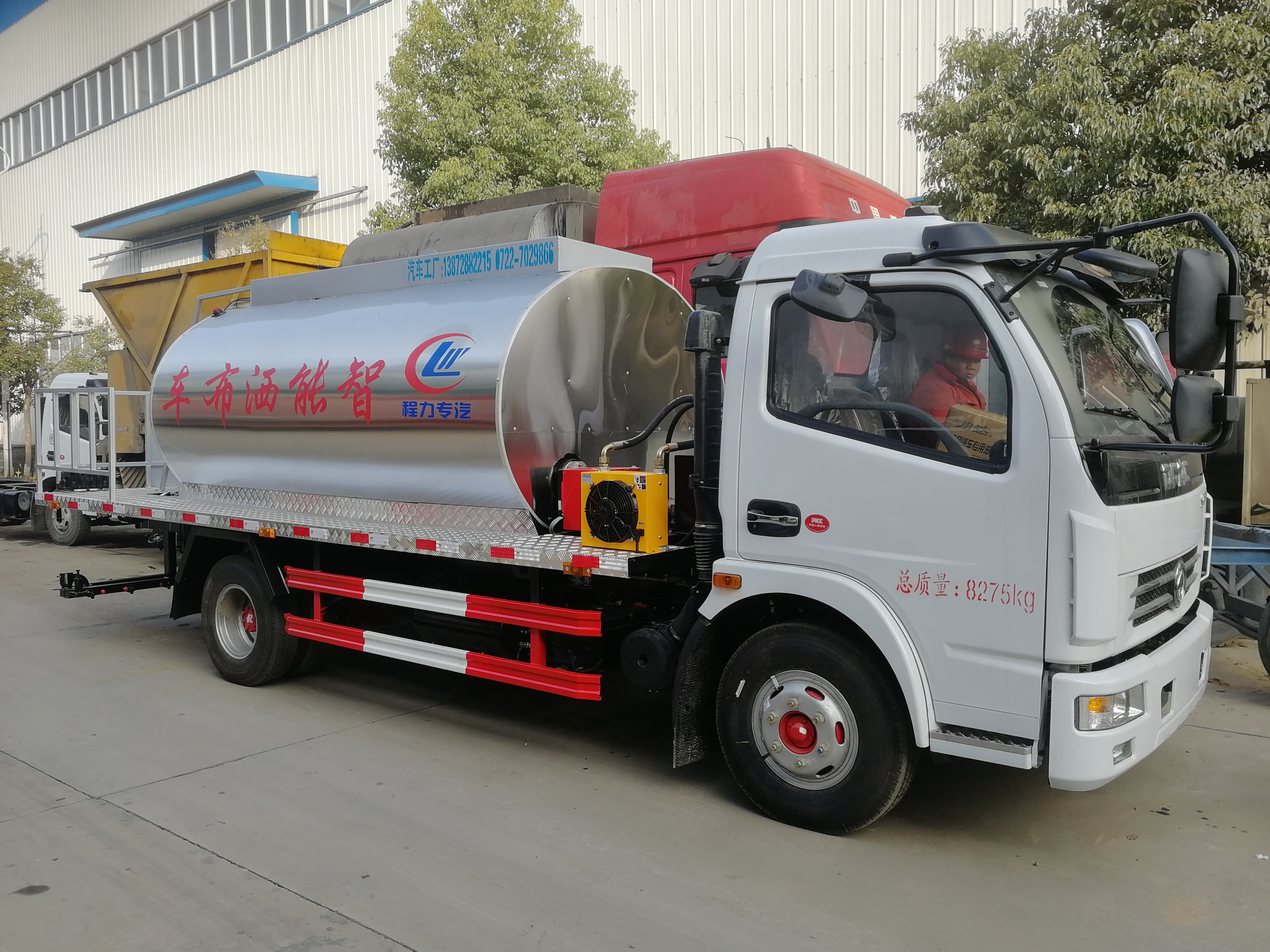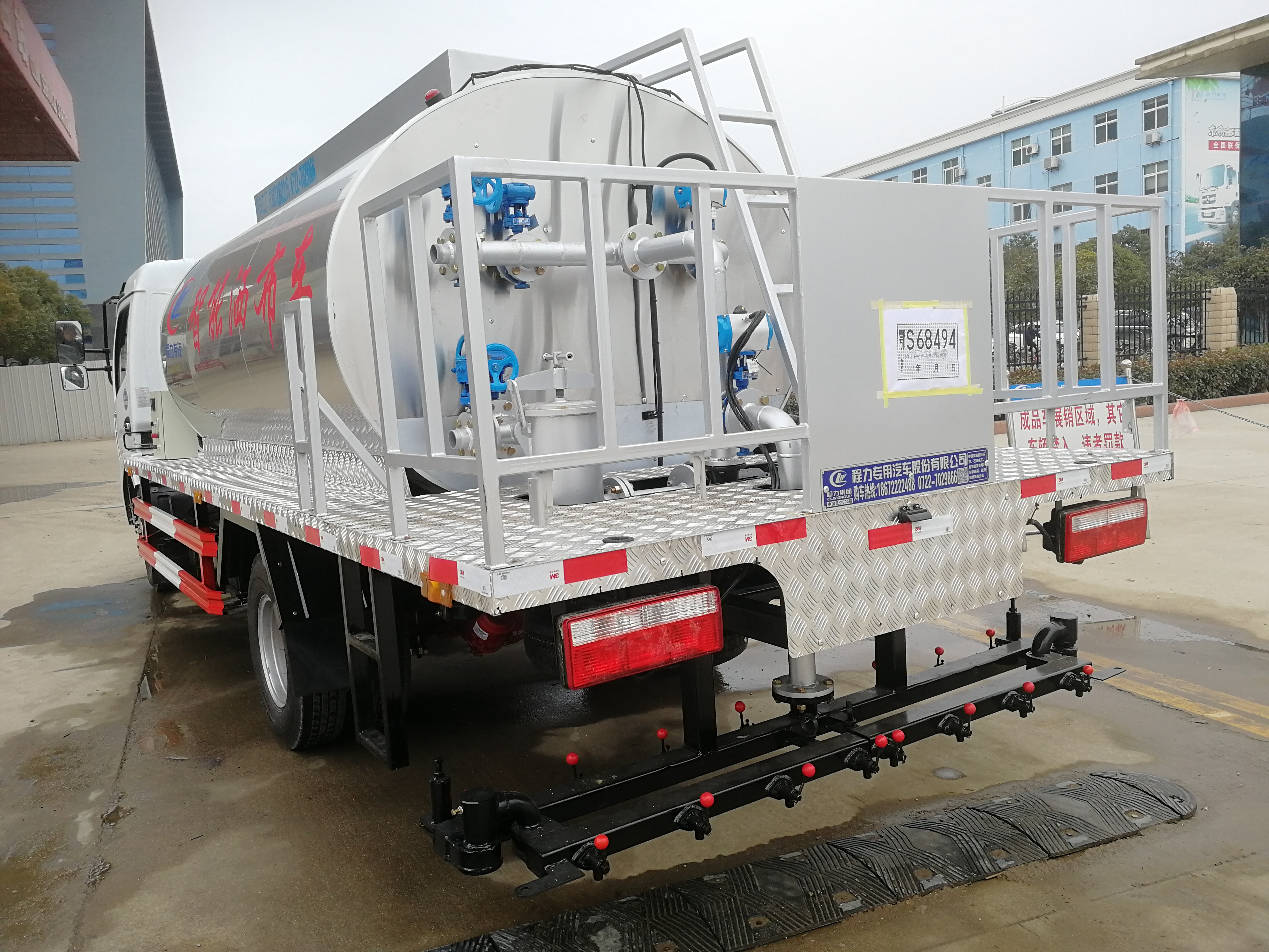 安徽蕪湖用戶到湖北程力自提東風多利卡瀝青灑布車,湖北程力東風多利卡普通型6噸瀝青灑布車配置:車輛型號:CLW5080GLQ5,底盤型號:EQ1080SJ8BDC。玉柴130馬力,6檔變速箱,3800mm 軸距,帶動力轉向,氣剎制動,7.50R16鋼絲胎,原廠空調,電動玻璃,帶中控鎖。