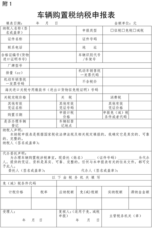 《車輛購置稅納稅申報表》填表說明 1.本表由車輛購置稅納稅人在辦理納(免、減)稅申報時填寫(打印),由納稅人簽章確認。 2.“納稅人名稱”欄,填寫辦理申報時提供的納稅人證件上注明的名稱。 3.“證件名稱”欄,單位納稅人填寫《統一社會信用代碼證書》或者《營業執照》或者其他有效機構證明;個人納稅人填寫《居民身份證》或者其他身份證明名稱。 4.“證件號碼”欄,填寫“證件名稱”欄填寫的證件的號碼。 5.“合格證編號(貨物進口證明書號)”“車輛識別代號/車架號”“廠牌型號”“排量(cc)”欄,分別按照車輛合格證或者《中華人民共和國海關貨物進口證明書》或者《中華人民共和國海關監管車輛進(出)境領(銷)牌照通知書》或者《沒收走私汽車、摩托車證明書》中對應的編號、車輛識別代號/車架號、車輛品牌和車輛型號、排量填寫。 6.“機動車銷售統一發票代碼”“機動車銷售統一發票號碼”“不含稅價”欄,分別按照機動車銷售統一發票相應項目填寫。 7.下列欄次由進口自用車輛的納稅人填寫: (1)“海關進口關稅專用繳款書(進出口貨物征免稅證明)號碼”欄,填寫《海關進口關稅專用繳款書》中注明的號碼;免征關稅應稅車輛填寫《進出口貨物征免稅證明》中注明的編號。 (2)“關稅完稅價格”欄,通過《海關進口關稅專用繳款書》《海關進口消費稅專用繳款書》《海關進口增值稅專用繳款書》或者其他資料進行采集,順序如下: ①《海關進口關稅專用繳款書》中注明的關稅完稅價格; ② 在免關稅的情況下,通過《海關進口消費稅專用繳款書》中注明的完稅價格和消費稅稅額計算關稅完稅價格; ③ 在免關稅和免或者不征消費稅的情況下,采用《海關進口增值稅專用繳款書》中注明的完稅價格; ④ 在關稅、消費稅和增值稅均免征或者不征的情況下,通過其他資料采集關稅完稅價格。 (3)“關稅”欄,填寫《海關進口關稅專用繳款書》中注明的關稅稅額。 (4)“消費稅”欄,填寫《海關進口消費稅專用繳款書》中注明的消費稅稅額。 8.“其它有效憑證名稱”“其它有效憑證號碼”“其它有效憑證價格”欄由未取得機動車銷售統一發票且非進口自用的納稅人按取得的相應證明資料內容填寫。 9.“購置日期”欄,填寫機動車銷售統一發票或者海關進口關稅專用繳款書(進出口貨物征免稅證明)或者其他有效憑證的開具或者生效日期。 10.“申報計稅價格”欄,分別按照下列要求填寫: (1)境內購置車輛,按照車輛相關憑證的不含稅價填寫; (2)進口自用車輛,按計稅價格填寫,計稅價格=關稅完稅價格+關稅+消費稅; 11.“申報免(減)稅條件或者代碼”欄,分別按照下列情形填寫文字或者代碼: A.外國駐華使館、領事館和國際組織駐華機構及其有關人員自用的車輛,免稅; B.中國人民解放軍和中國人民武裝警察部隊列入裝備訂貨計劃的車輛,免稅; C.懸掛應急救援專用號牌的國家綜合性消防救援車輛,免稅; D.設有固定裝置的非運輸專用作業車輛,免稅; E.城市公交企業購置的公共汽電車輛,免稅; F.國務院規定予以免稅或者減稅的其他情形的,按照規定免稅或者減稅。 12.“是否辦理車輛登記”欄,如填寫“是”,則“車輛擬登記地點”欄應填寫具體縣(市、區)。 13.本表一式二份(一車一表),一份由納稅人留存,一份由主管稅務機關留存。