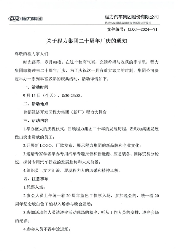 關(guān)于程力集團(tuán)二十周年廠慶的通知 尊敬的程力家人們: 時(shí)光荏苒,歲月如梭。在這個(gè)秋高氣爽,充滿希望與收獲的季節(jié)里,程力集團(tuán)即將迎來(lái)二十周年廠慶,為了慶祝這一具有重大意義的時(shí)刻,集團(tuán)公司決定舉辦一系列豐富多彩的慶典活動(dòng),活動(dòng)詳情如下: 一、活動(dòng)時(shí)間 9月15日(全天),8:30-23:58。 二、活動(dòng)地點(diǎn) 曾都經(jīng)濟(jì)開(kāi)發(fā)區(qū)程力集團(tuán)(新廠)程力大舞臺(tái) ![]() 三、活動(dòng)內(nèi)容 1.舉辦盛大的慶祝儀式,回顧程力集團(tuán)二十年的發(fā)展歷程,表彰為集團(tuán)發(fā)展做出突出貢獻(xiàn)的員工; 2.開(kāi)展新LOGO、廠歌發(fā)布,展示程力集團(tuán)的新品牌和企業(yè)文化; 3.邀請(qǐng)專家學(xué)者舉辦專用汽車專題報(bào)告和新能源、應(yīng)急裝備、國(guó)際貿(mào)易分論壇,探討專用汽車行業(yè)的發(fā)展趨勢(shì)和未來(lái)前景; 4.組織員工文藝匯演,展現(xiàn)程力人的風(fēng)采和精神風(fēng)貌。 四、注意事項(xiàng) 1.憑票入場(chǎng); 2.參會(huì)人員上午統(tǒng)一著20周年藍(lán)色T恤衫入場(chǎng),參加晚會(huì)的,統(tǒng)一著20 周年紀(jì)念版白色T恤衫入場(chǎng)參與晚會(huì)互動(dòng); 3.參加活動(dòng)的人員請(qǐng)遵守活動(dòng)現(xiàn)場(chǎng)的秩序,聽(tīng)從工作人員的安排,遵守會(huì)場(chǎng)的紀(jì)律; 4.參會(huì)人員不得中途退場(chǎng); 5.請(qǐng)大家在活動(dòng)期間注意安全,確保人身和財(cái)產(chǎn)安全; 6.請(qǐng)各子公司、各部門提前做好活動(dòng)準(zhǔn)備工作,確保活動(dòng)順利進(jìn)行; 二十年風(fēng)雨兼程,二十載春華秋實(shí),程力集團(tuán)的二十年,是拼搏奮進(jìn)的二十年,是開(kāi)拓創(chuàng)新的二十年,以二十周年廠慶為新的起點(diǎn),鄭重邀請(qǐng)各位程力家人們出席公司“20周年慶”活動(dòng),共同分享程力集團(tuán)的美好時(shí)刻,為實(shí)現(xiàn)程力集團(tuán)愿景目標(biāo)而努力奮斗! 特此通知。 ![]() ![]() |