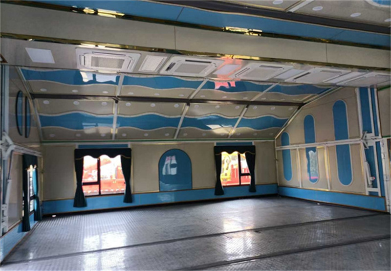 整車尺寸整車12米,箱體9.6米,箱體展開寬11.2米,長8.25米,內部適用面積93平方,同時可以容納150人左右,可以擺放10-16桌。