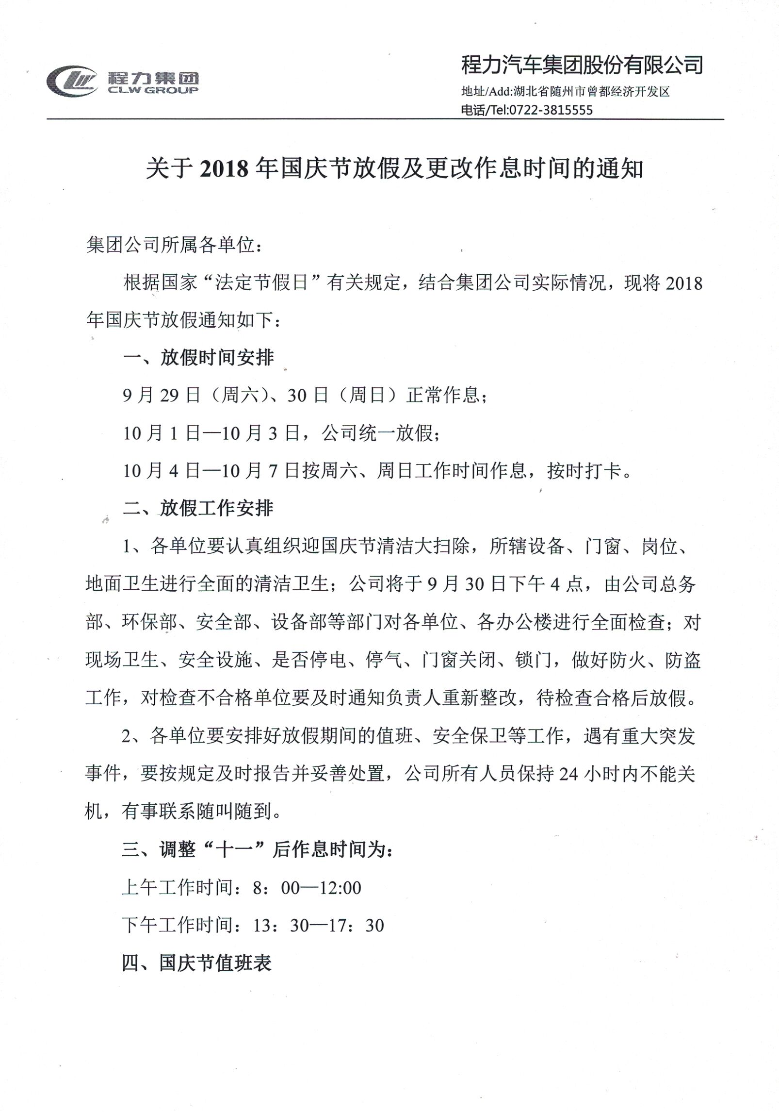 湖北程力公司2018年“國慶節”放假值班人員安排及更改作息時間的通知