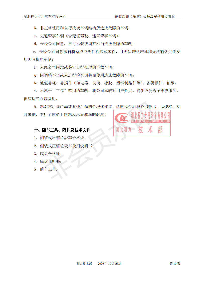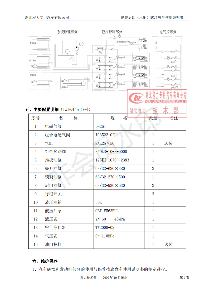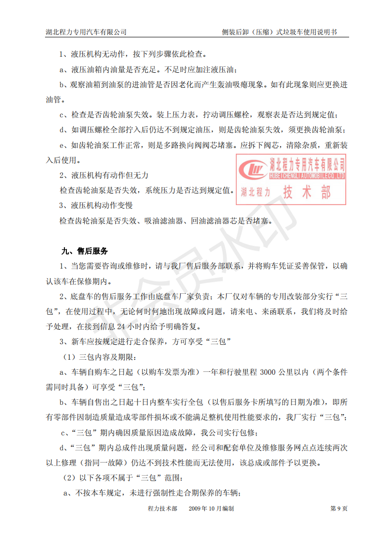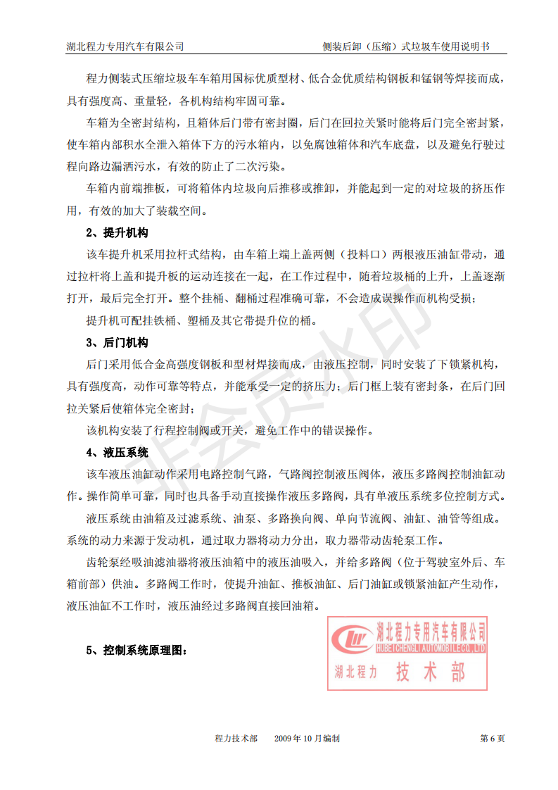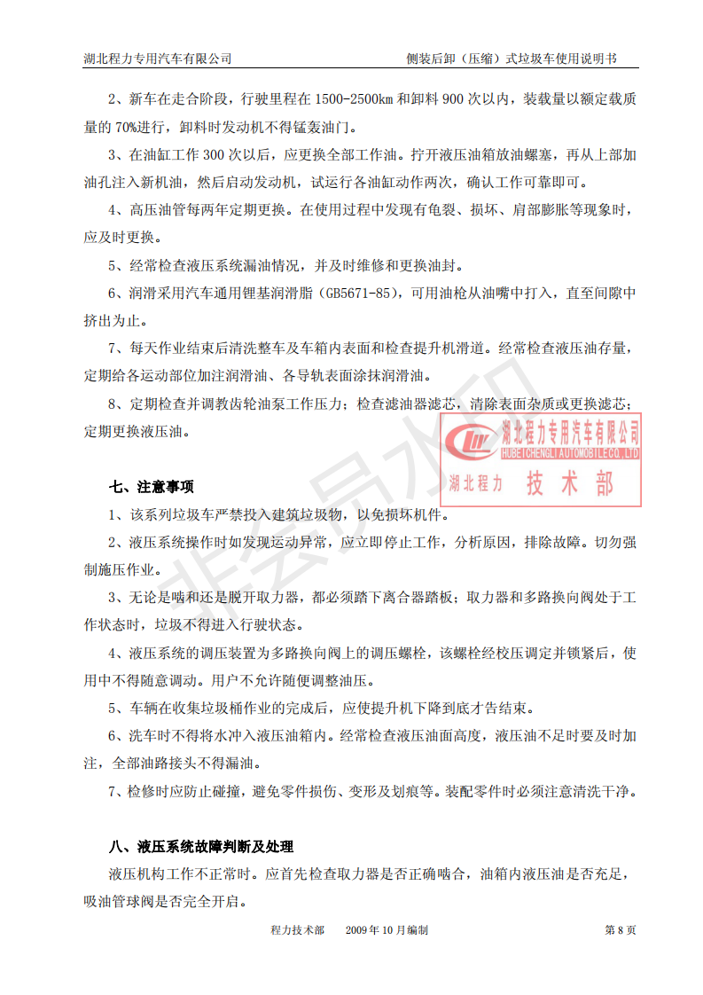 湖北程力側裝后卸(壓縮)式掛桶垃圾車使用說明書