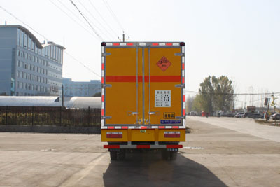 運(yùn)輸品名:炸藥,雷管,煙花爆竹等,類項(xiàng)號:1.1B,1.1D,1.1G,1.2G,1.3G,1.4G 等。廂體頂部封閉不可開啟,側(cè)、后防護(hù)裝置材料材質(zhì)為Q235A碳鋼,側(cè)防護(hù)與箱體底部焊接連接,后防護(hù)裝置與車架采用焊接連接,后防護(hù)截面尺寸(mm):100×50,離地高度為450mm。該車隨底盤選裝駕駛室,選裝側(cè)面開門。僅選用發(fā)動(dòng)機(jī)型號: ISB3.9-125E40A、YC4E140-42對應(yīng)的油耗值分別為(L/100km): 18.83、19.39。安裝前輪盤式制動(dòng)器,安裝子午線輪胎和帶ABS的底盤。安裝帶有衛(wèi)星定位功能的行駛記錄儀。ABS系統(tǒng)生產(chǎn)廠家/型號:東風(fēng)電子科技股份有限公司汽車制動(dòng)系統(tǒng)公司/36BG13-30010。 |